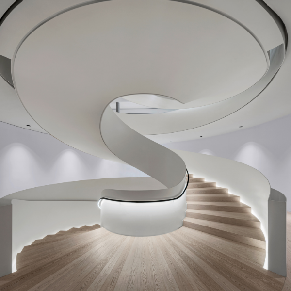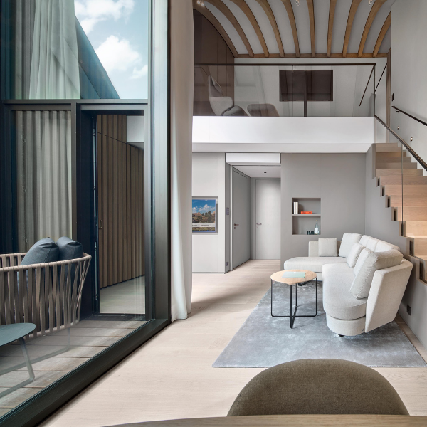 Ein architektonischer Blickfang ist die elegante Treppe aus Stahl und Eiche, die alle Ebenen des Hauses miteinander verbindet – ein Sinnbild für die Verbindung von Struktur, Natürlichkeit und modernem Design, die das gesamte Konzept des Lanserhof Sylt durchdringt.